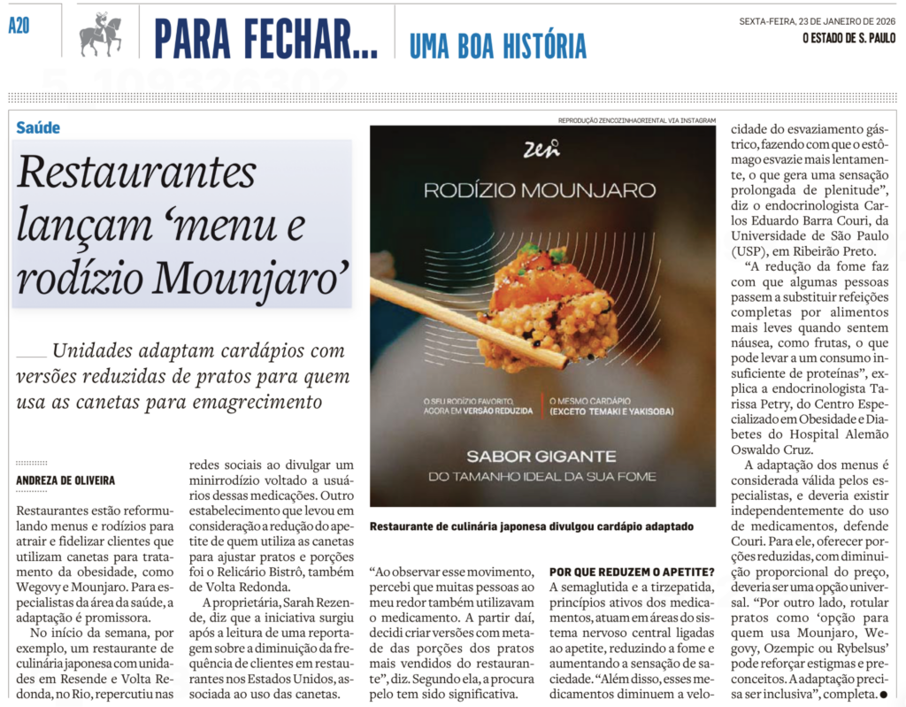 O grande destaque vai para casos como o de um restaurante de culinária japonesa no Rio de Janeiro que viralizou ao lançar o “Rodízio Mounjaro”. O slogan é genial em sua simplicidade: “O seu rodízio favorito, agora em versão reduzida. Sabor gigante, do tamanho ideal da sua fome”. Outro exemplo é o Relicário Bistrô, que também passou a considerar a redução do apetite para ajustar seus pratos e porções.